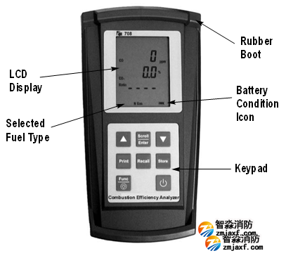 Func功能鍵用于選擇708的功能模式,讓您可以設(shè)定708作為一個燃燒分析儀,壓力表,溫度計,或可燃檢漏儀。此外,該功能鍵可用來訪問日期/和時間顯示。有關(guān)功能鍵的更多信息見第6條,