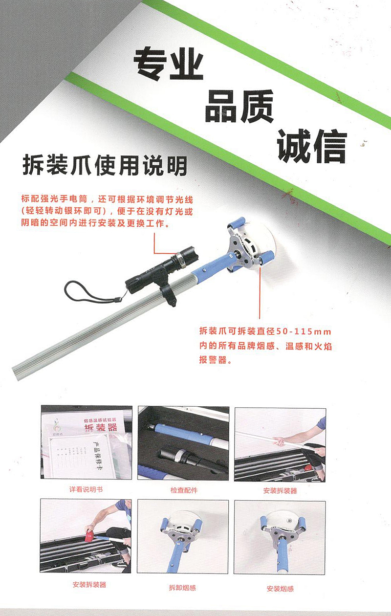 本品自帶手電功能,桿子可以拉長長可以達到8米,避免拆鋁格柵即可拆裝頂板上的探測器。大面積車庫先裝底座,后裝設備時,可發揮單人操作施工效率到。大面積拆裝清洗也極其方便。