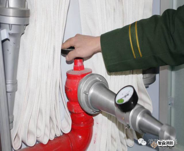 (c)打開消火栓閥門放水此時不應壓折水帶,壓力表顯示的水壓即為消火栓栓口的水壓力。