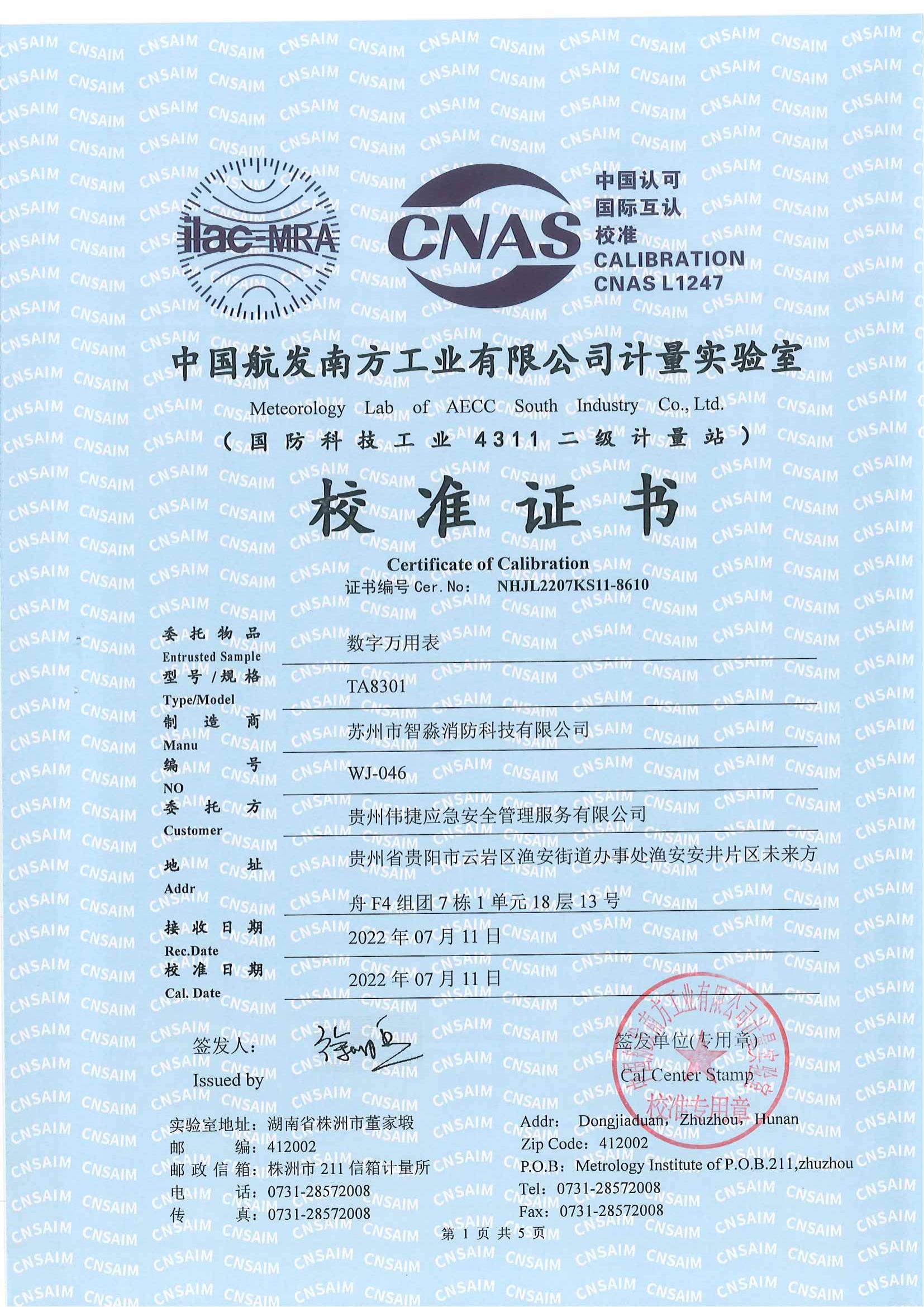西安數字萬用表校準證書報告