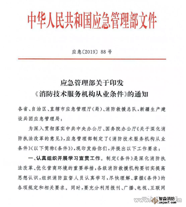 為深入貫徹落實中共中央辦公廳、國務(wù)院辦公廳《關(guān)于深化消防執(zhí)法改革的意見》,應(yīng)急管理部制定了《消防技術(shù)服務(wù)機構(gòu)從業(yè)條件》(以下簡稱《條件》),現(xiàn)印發(fā)給你們,并提出以下工作要求: